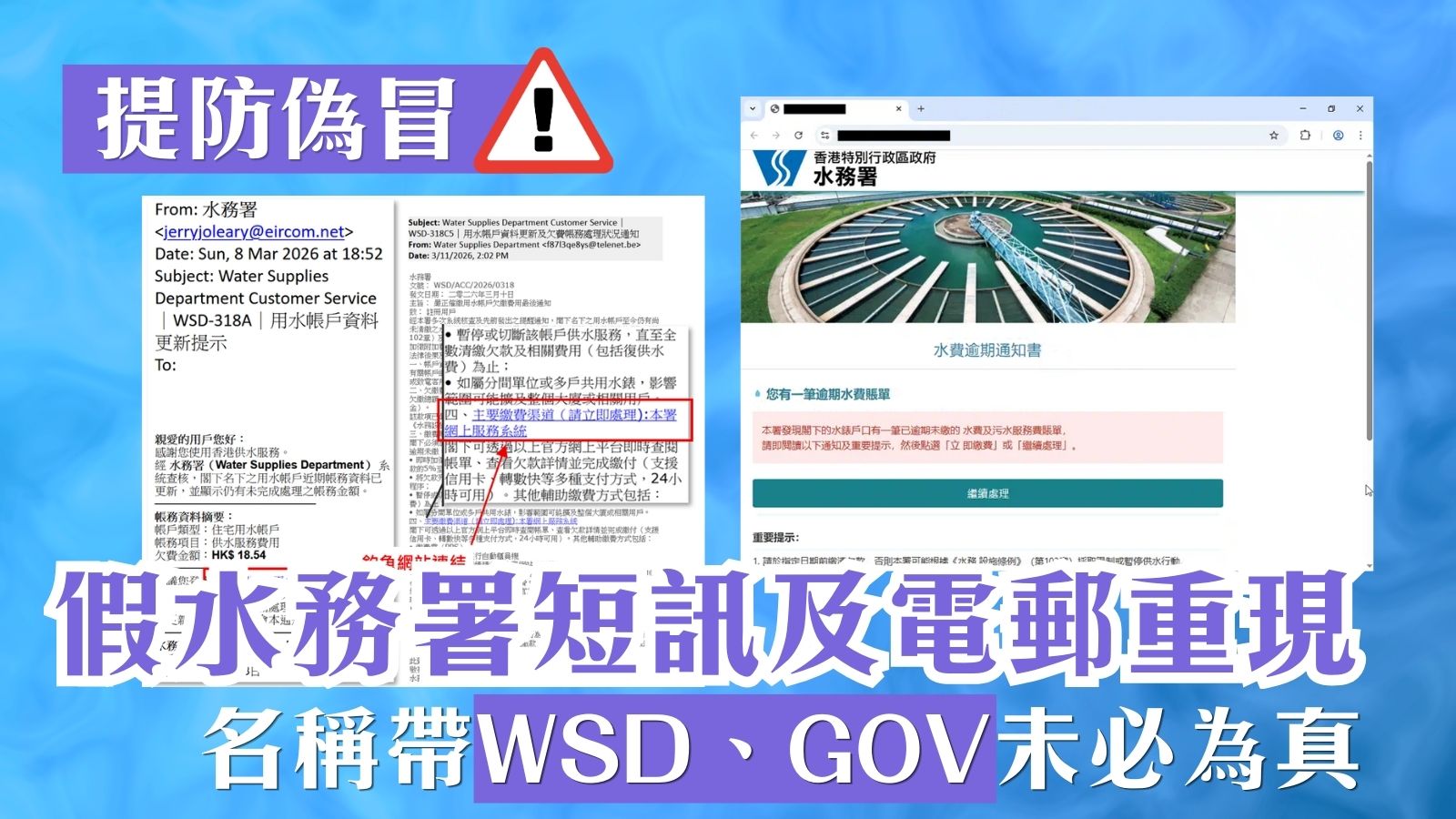 水務署官方網址為 www.wsd.gov.hk,騙徒會使用貼近官網的假域名如: