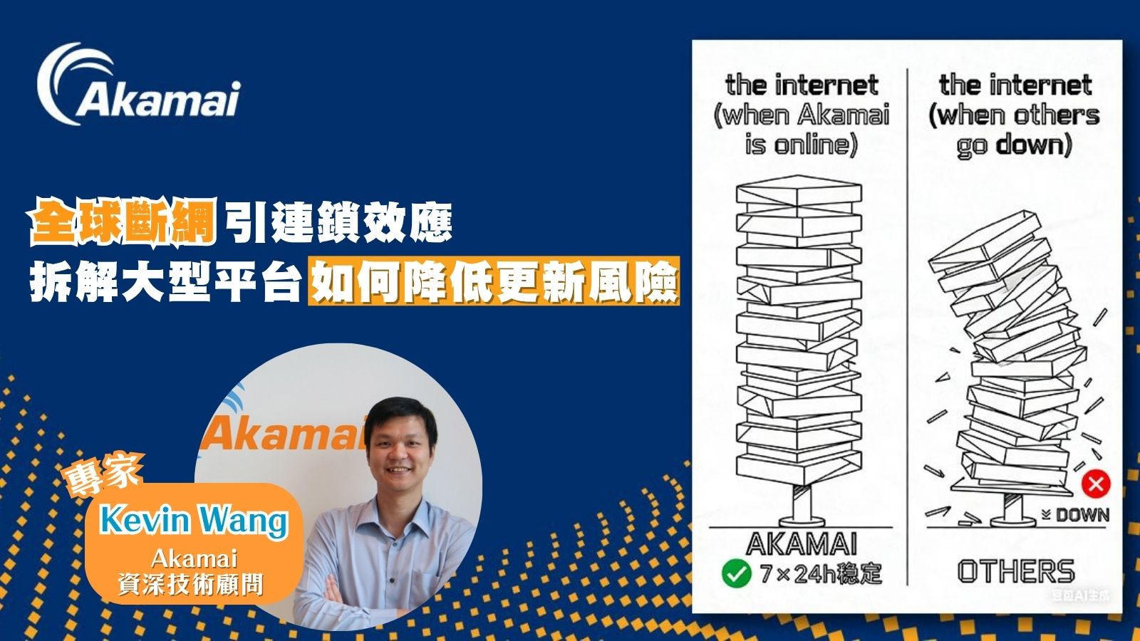 Akamai 資深技術顧問王明輝(Kevin Wang)從技術角度出發,討論大型平台如何降低更新與變更的風險,並以 Akamai 的治理思維作為示例;同時也提供企業在自有網絡架構中提升韌性的建議。