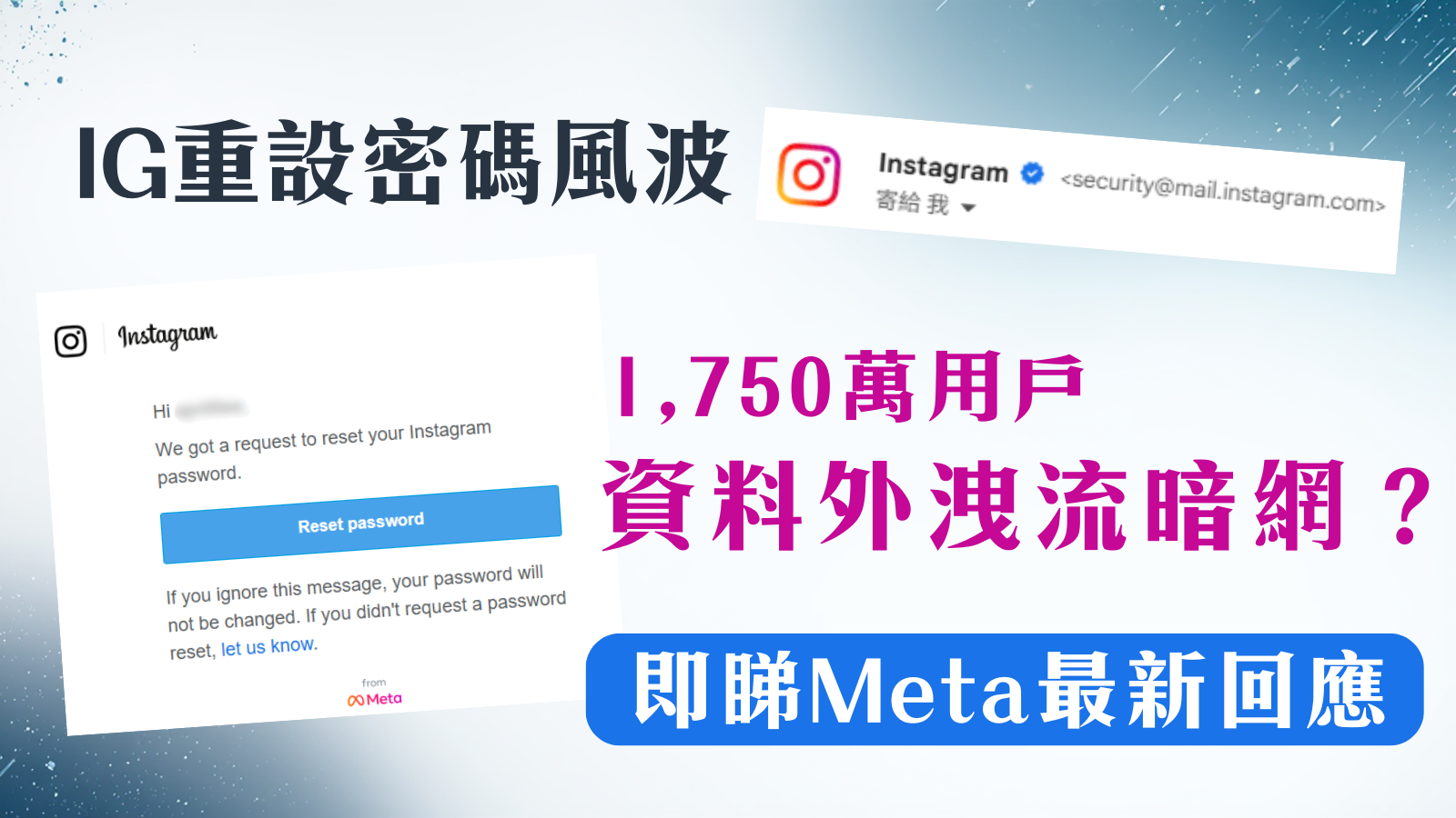 全球各地 Instagram 用戶近日紛紛收到重設密碼電郵,隨即有網安公司發警告,指有約 1,750 萬筆帳戶資料疑似外洩,包括使用者名稱、電郵,甚至透過重設密碼功能試圖奪取帳號,引發一輪恐慌!及後 Meta 發聲明,稱已修復漏洞,否認系統遭入侵。 近日大批 Instagram 用戶無主動操作下,收