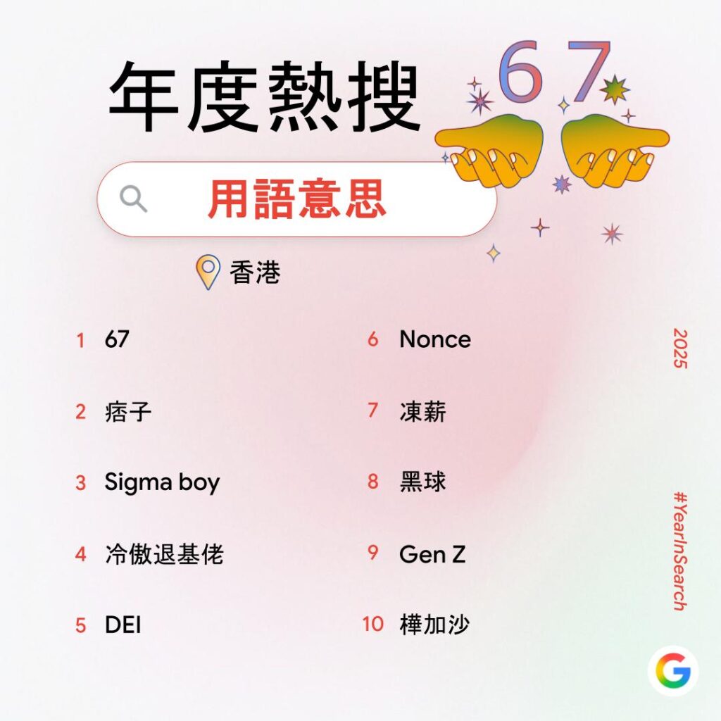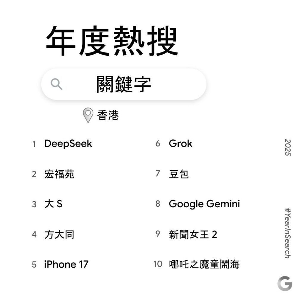 Google 香港公布 2025 年度搜尋榜,彙整去年搜尋量飆升得最高的關鍵字,透過數據回顧 2025 年港人關注的話題。其中人工智能(AI )工具佔十大「熱搜關鍵字」四席,包括榜首的「DeepSeek」,「Grok」、「豆包」 和「 Google Gemini 」,反映港人積極探索不同 AI 工具,對 AI 應用的興趣及需求顯著。至於「熱搜用語意思」,則由全球 Z 世代和 Alpha 世代中流行的「67」踞榜首。